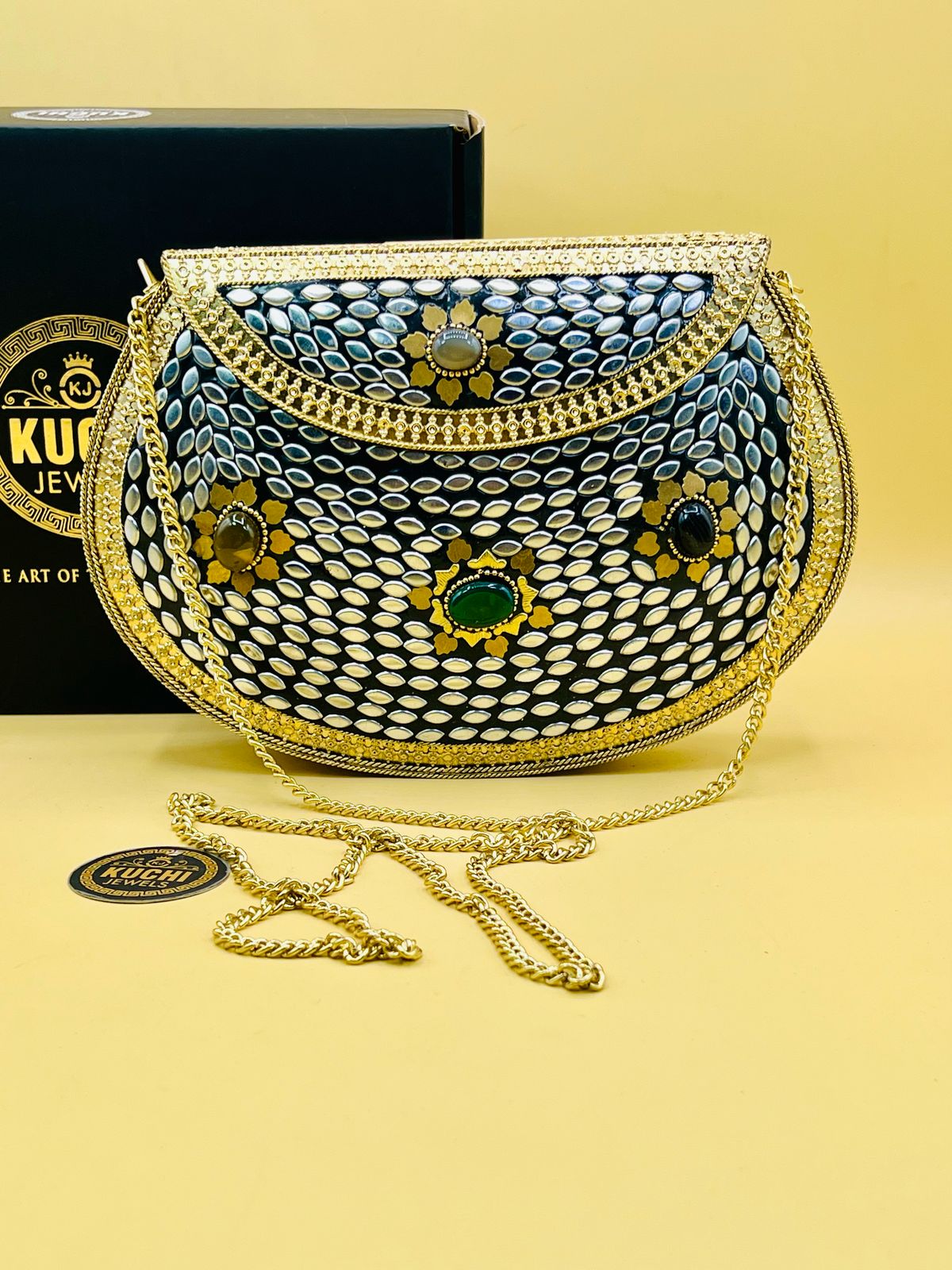 This D Shape Stone Metal Bag is crafted with high quality silver and golden metal, for a stylish and elegant look. The D shape design adds a unique touch, while the stone accents bring a touch of sophistication. Perfect for adding a touch of glamour to any outfit.
