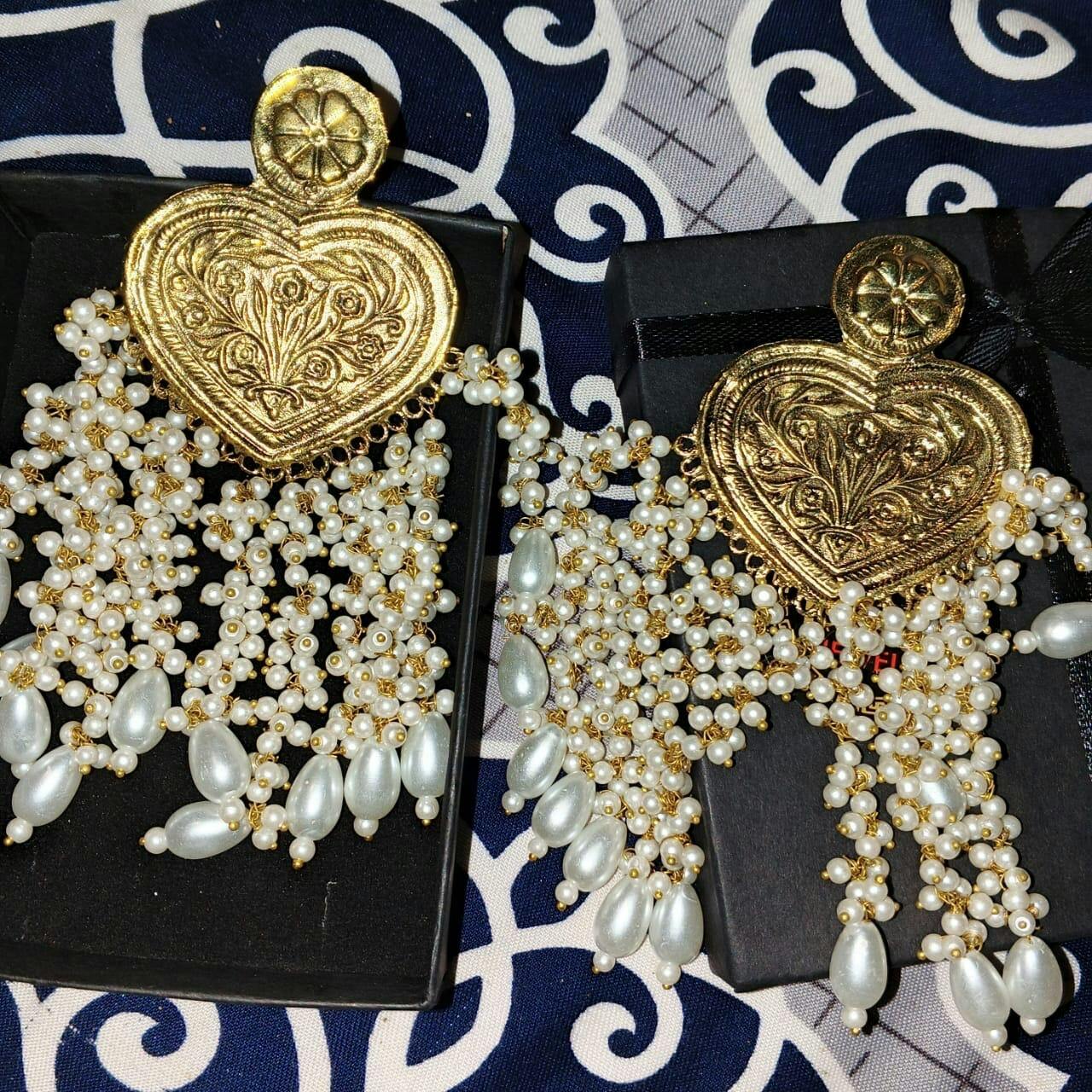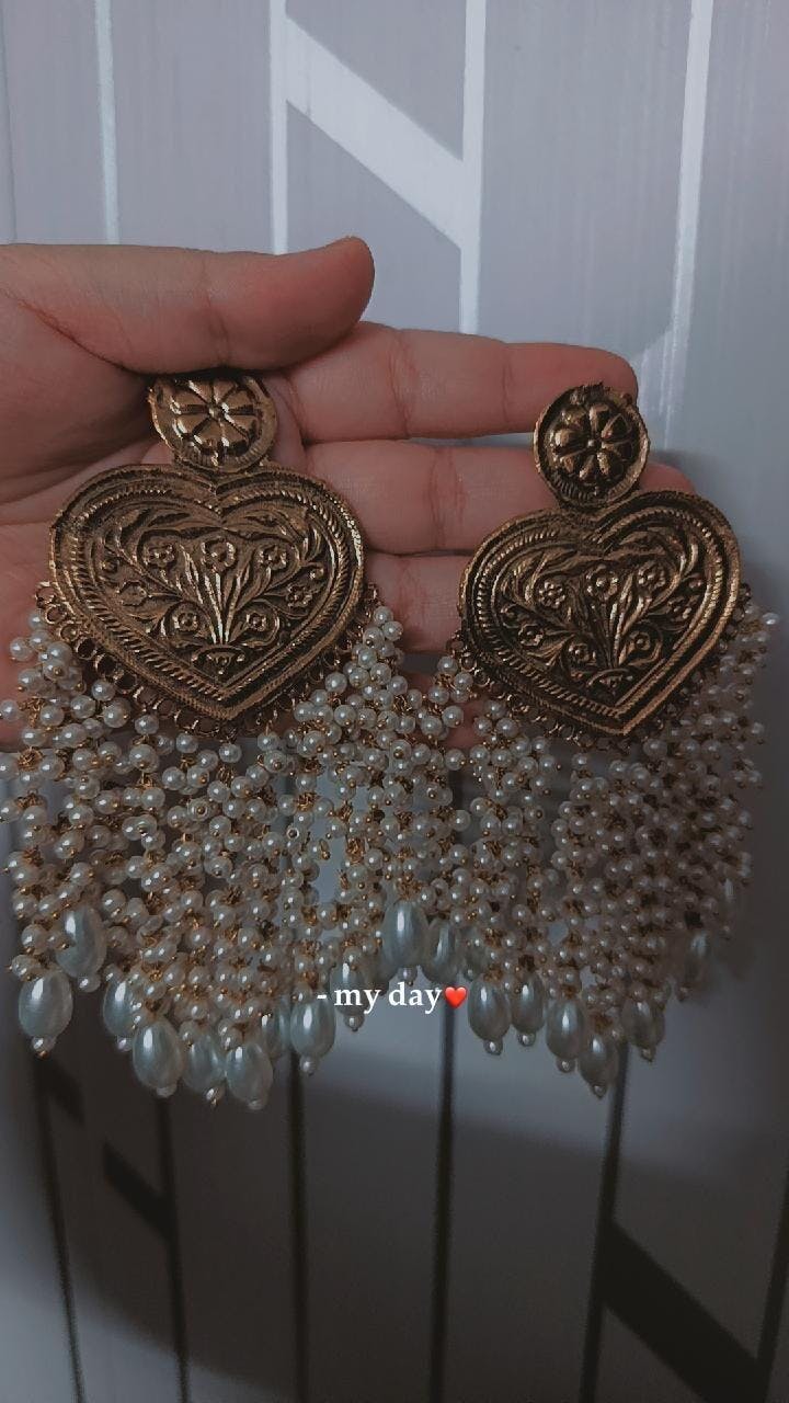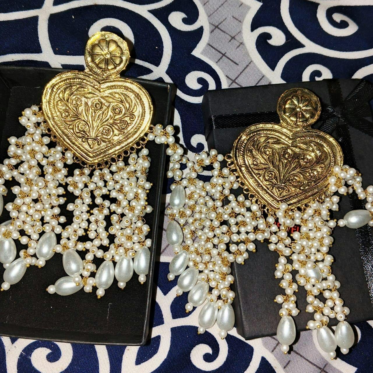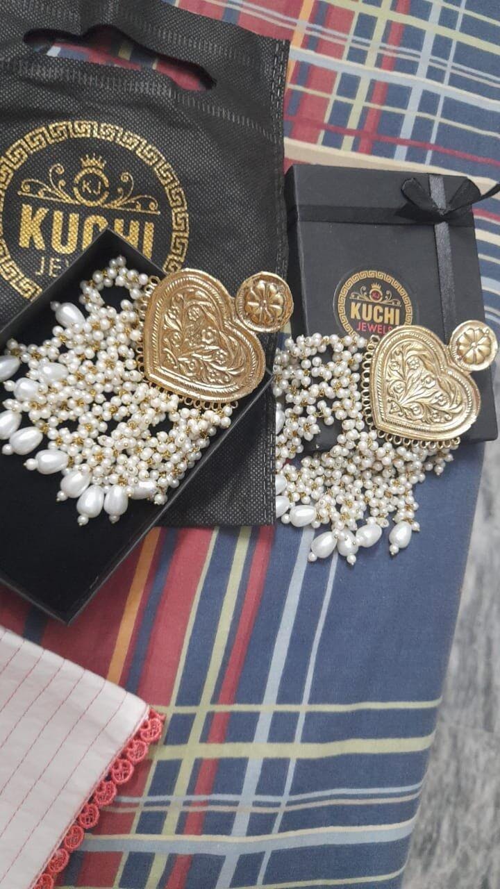 Long Pearl Golden Stylish Ear Rings for Girls These gorgeous Long Pearl Golden Stylish Ear Rings for Girls are a masterpiece of Kuchi craftsmanship. The beautiful Afghani earrings are made of high-quality gilded metal alloy. The heart-shaped earrings are adorned with attractive designs and decked with stunning pearls and beads attached with expertly made delicate metal alloy chain links. This beautiful pair can complement any dress that you choose for the festive event.