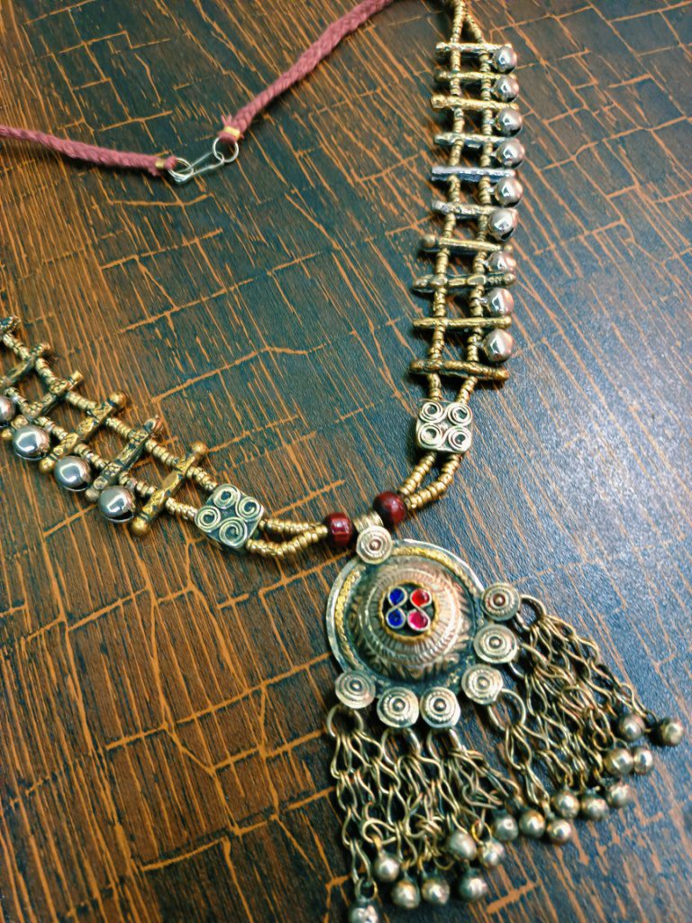 Round Pendant and Bells Gypsy Necklace\n\nThe stunning piece of jewelry that has caught your gaze is expertly handcrafted by Kuchi tribal artisans. This Round Pendant and Bells Gypsy Necklace is a fine example of traditional Gypsy jewelry designs. The article is made of excellent quality German-Silver metal. The cord of necklace is excellent quality with metal beads. The necklace is adorned with a beautiful metal pendant decked with colorful beads and hanging metal bells. The article is light weight and easy to wear for the user. The necklace can be worn at any party or festival and can be real eye catcher.\n\nSize:- 60cm\n\nWe are living in latest fashion era but we are strongly connecting with the tribal values. Kuchijewels is a platform where resellers, costume makers, program organizers can find there require products at competitive prices with high quality. The motive of kuchijewels is to spread the traditional values of tribal people with their vintage fashion into new era.