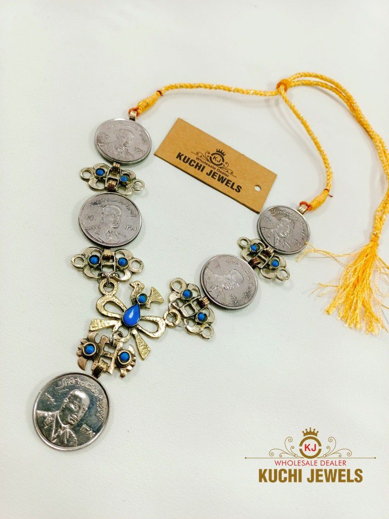 Spike Edge Smart Choker\n\nThis gorgeous Spike Edge Smart Choker is handcrafted by skilled Kuchi tribal artisans. The colorful, durable fabric cord is attached to a chain-link made antique coins and expertly crafted metal ornaments. The pendant is made of high-quality German Silver alloy, carved into a beautiful bird atop an expertly crafted bow. The pendant is also decked with an antique coin. The metal ornaments and the pendant are all decorated with colorful artificial stones. You can wear this beautiful, eye-catching stylish choker at parties, festivities and other such jovial events, or you can also wear it on formal events. This is light weight and easy to wear piece of jewelry.\n\nSize:- Choker 25cm plus adjustable cord
