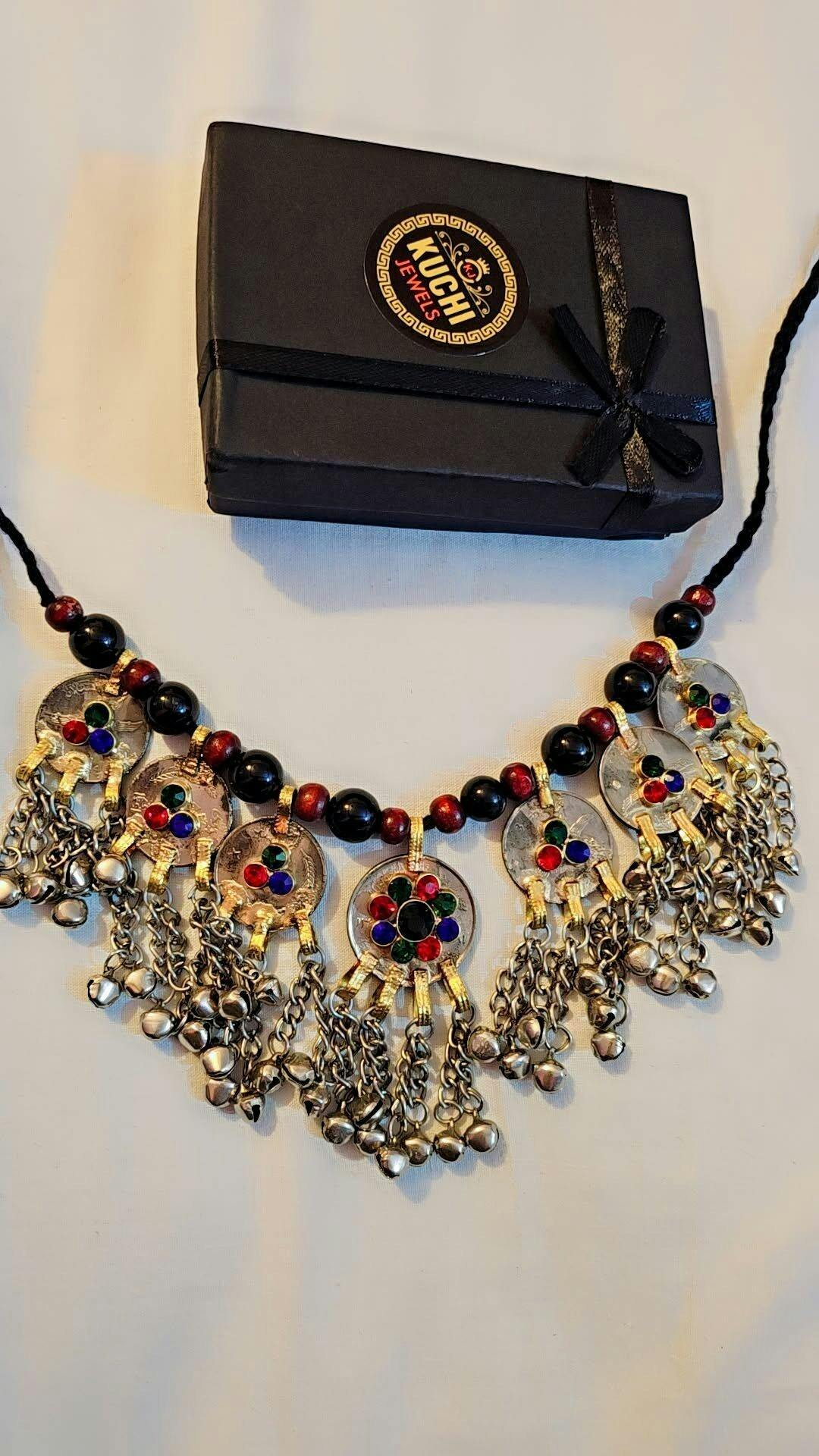 Description: This unique necklace features a charming combination of vintage coins and small bells, creating a distinctive and timeless design. The addition of wooden black beads enhances the overall aesthetic, providing a touch of earthy elegance.