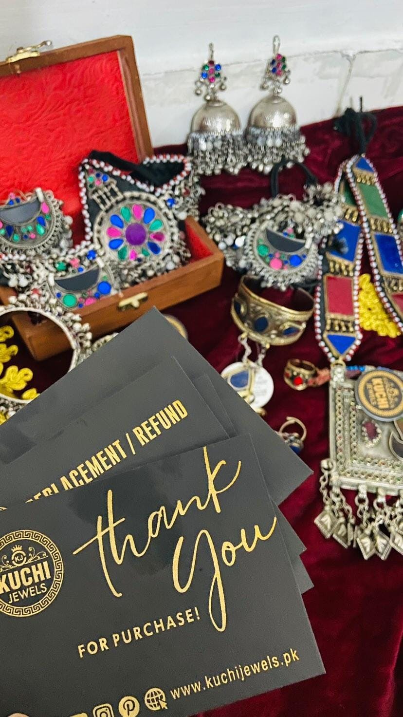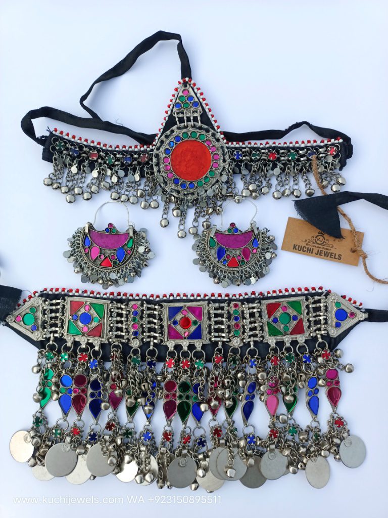 Double Bells Layer Choker Set\n\nThis stunning Double Bells Layer Choker Set consists of a choker, a head piece and a pair of beautiful ear rings. All the pieces of this gorgeous set are made of high-quality German-Silver metal. The articles are adorned with exquisite, colorful, synthetic crystals. The head piece is decorated with jingling hanging metal bells. The choker, in addition to the stunning crystals, is also adorned with hanging metal round buttons that are adorned with traditional engravings and designs. The buttons are also decked with colorful crystal beads. This stunning Double Bells Layer Choker Set can be worn at parties, festivities or celebrations. The whole set is a masterpiece of the Kuchi craftsmanship.\n\nSet include Choker , Head Piece and  Ear rings\n\nSize:- Choker 28x20cm plus 30cm adjustable cord\n\nEar Rings 6x4.5cm\n\nHead Piece 26x10cm\n\nWe are living in latest fashion era but we are strongly connecting with the tribal values. Kuchijewels is a platform where resellers, costume makers, program organizers can find there require products at competitive prices with high quality. The motive of kuchijewels is to spread the traditional values of tribal people with their vintage fashion into new era.