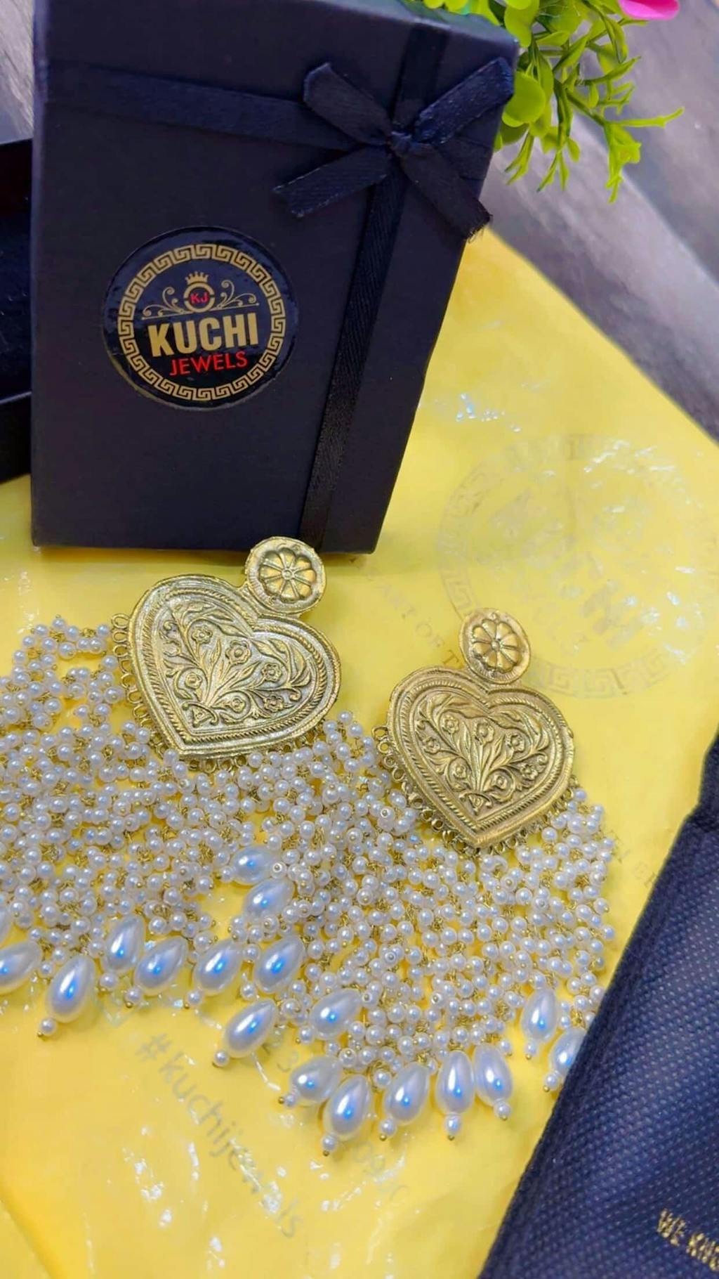 Long Pearl Golden Stylish Ear Rings for Girls These gorgeous Long Pearl Golden Stylish Ear Rings for Girls are a masterpiece of Kuchi craftsmanship. The beautiful Afghani earrings are made of high-quality gilded metal alloy. The heart-shaped earrings are adorned with attractive designs and decked with stunning pearls and beads attached with expertly made delicate metal alloy chain links. This beautiful pair can complement any dress that you choose for the festive event.