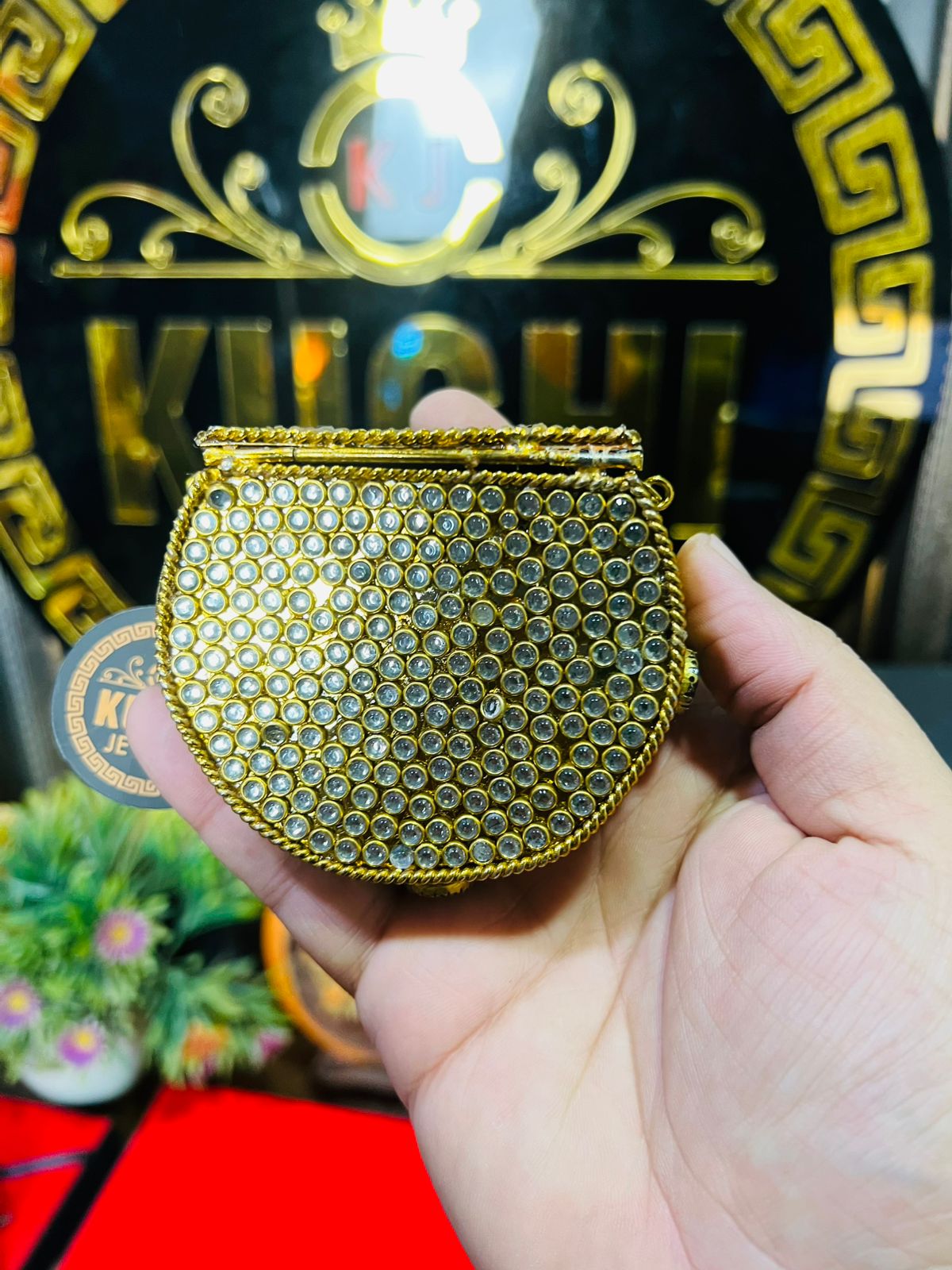 Elevate your accessory collection with this exquisite Mini Baby Kundan Indian Metal Bag. Crafted with traditional kundan embellishments and premium metal construction, this compact piece seamlessly blends heritage artistry with contemporary elegance. Perfect for festive occasions, weddings, or evening gatherings, the intricate detailing showcases authentic Indian craftsmanship. The structured metal frame ensures durability while the kundan work adds timeless sophistication. An ideal choice for those who appreciate fine jewelry-inspired accessories and cultural aesthetics.