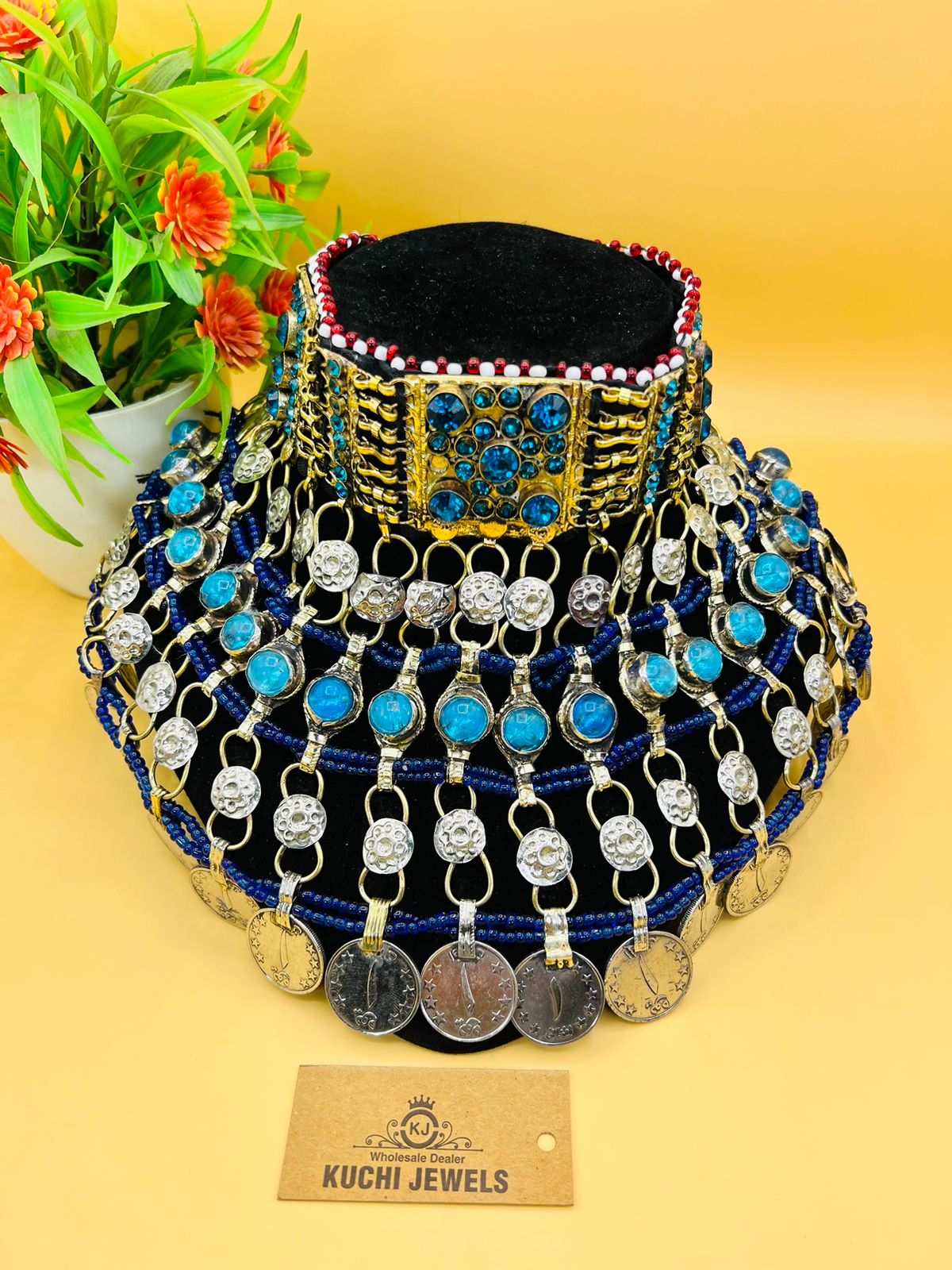 The Multi Crystal Stone and Antique Coins Afghan Choker is a splendid and culturally rich piece of jewelry that beautifully combines traditional Afghan coins with an array of colorful crystal stones. This choker features vintage Afghan coins that often bear intricate traditional Afghan motifs, offering a glimpse into the country's rich history and heritage.