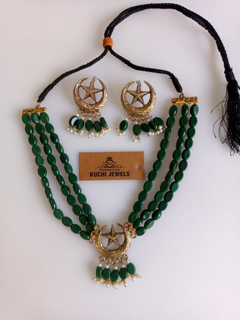 Multi Oval Stone Moon Star Choker Set This stunning Multi Oval Stone Moon Star Choker Set that you are looking at right now is a masterpiece of Kuchi artisanship. The set is skillfully handcrafted by expert Kuchi craftsmen. It comprises of a stunning choker with a pair of exquisite earrings that match with the pendant of the choker. The choker is made using high-quality cotton fabric cord that is connected to a tri-layer of cotton threads. These three layers of the sturdy cotton string are threaded with beautiful, colorful stone beads and are connected to a central gilded German Silver metal alloy pendant in the shape of a beautiful moon and star. The pendant is also decked with the colorful oval stones and tiny white pearls. The pair of earrings are match the design of the choker’s pendant i.e. in the shape of a crescent and a star and decked with pearls and stones. The gorgeous set can be worn at any joyous occasion like weddings, parties, ceremonies, etc. and can easily complement any attire that you wish to wear for such an occasion. Available in different colors.
