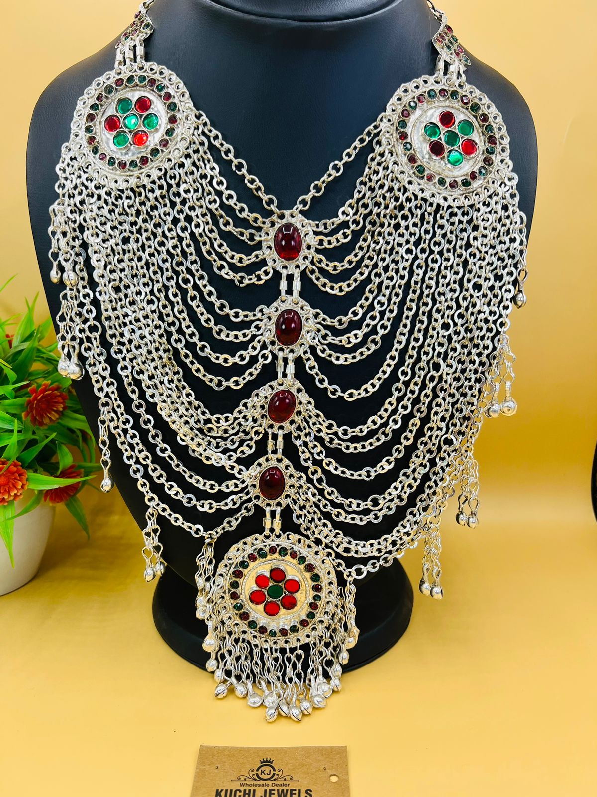 This necklace is characterized by a long silver-plated chain that can be worn draped over the neck or chest. The chain often incorporates intricate and traditional Afghan motifs and patterns, which may include geometric shapes, filigree work, and other decorative elements.