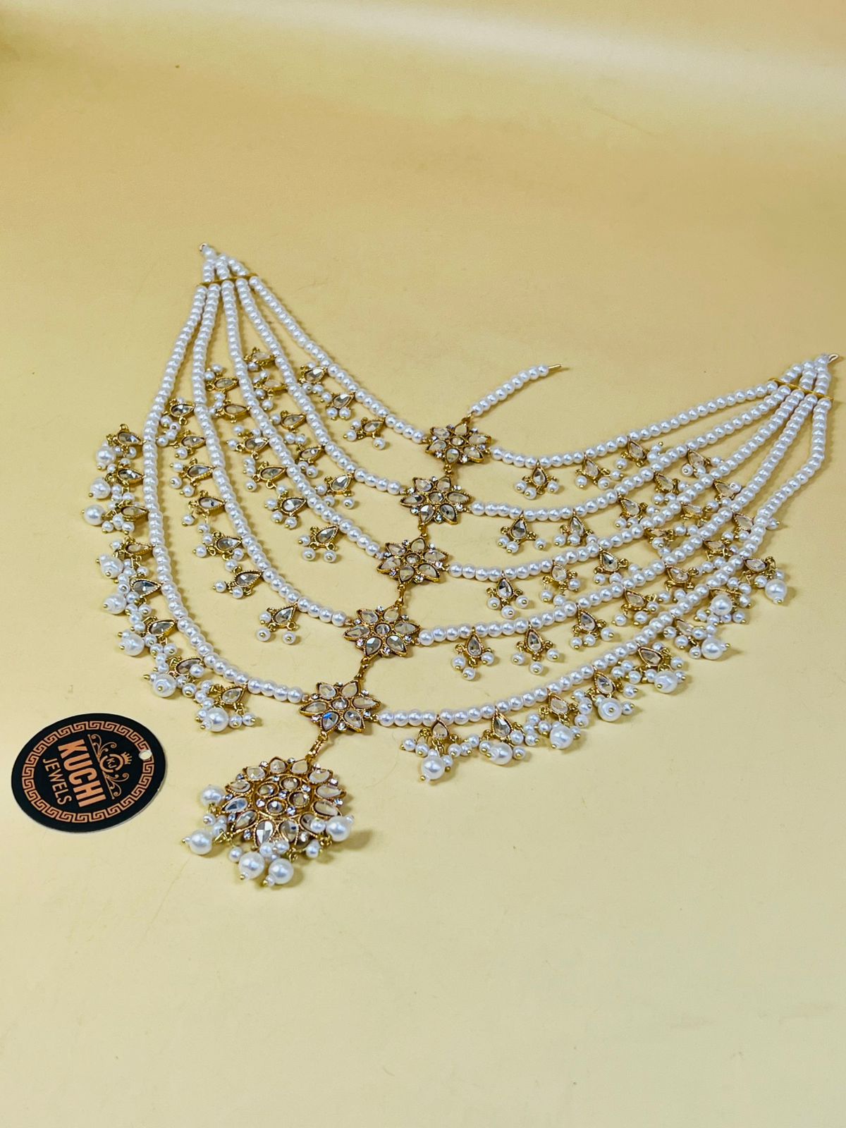 White Pearl And Kundan Work 6 Layer Head Piece